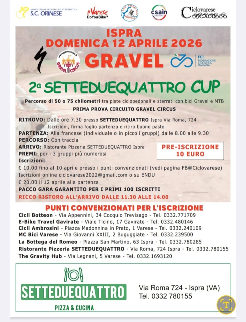 La manifestazione curata dal punto di vista tecnico dalla Società Ciclistica Orinese è valida come prova del Campionato Regionale Lombardo FCI Gravel a squadre e fa parte del progetto DoYouBike della Camera di Commercio di Varese. Primo punto di ristoro sul lungolago di Gavirate, ristoro finale a Ispra curato dallo staff del ristorante 724. Quota di adesione fino a venerdì 10 aprile solo 10 Euro, sarà inoltre possibile iscriversi il giorno dell’evento. Fabrizio Astuto, responsabile di Gravel Circus, ha concluso: “ La collaborazione tra società organizzatrici lombarde e piemontesi sta dando dei buoni risultati. Inoltre il riconoscimento del circuito avuto da Specialized Italia ci è stato di grande aiuto Non resta che iniziare a pedalare e il buon risconto avuto dalla 724 Cup ci stimola a fare sempre meglio”.